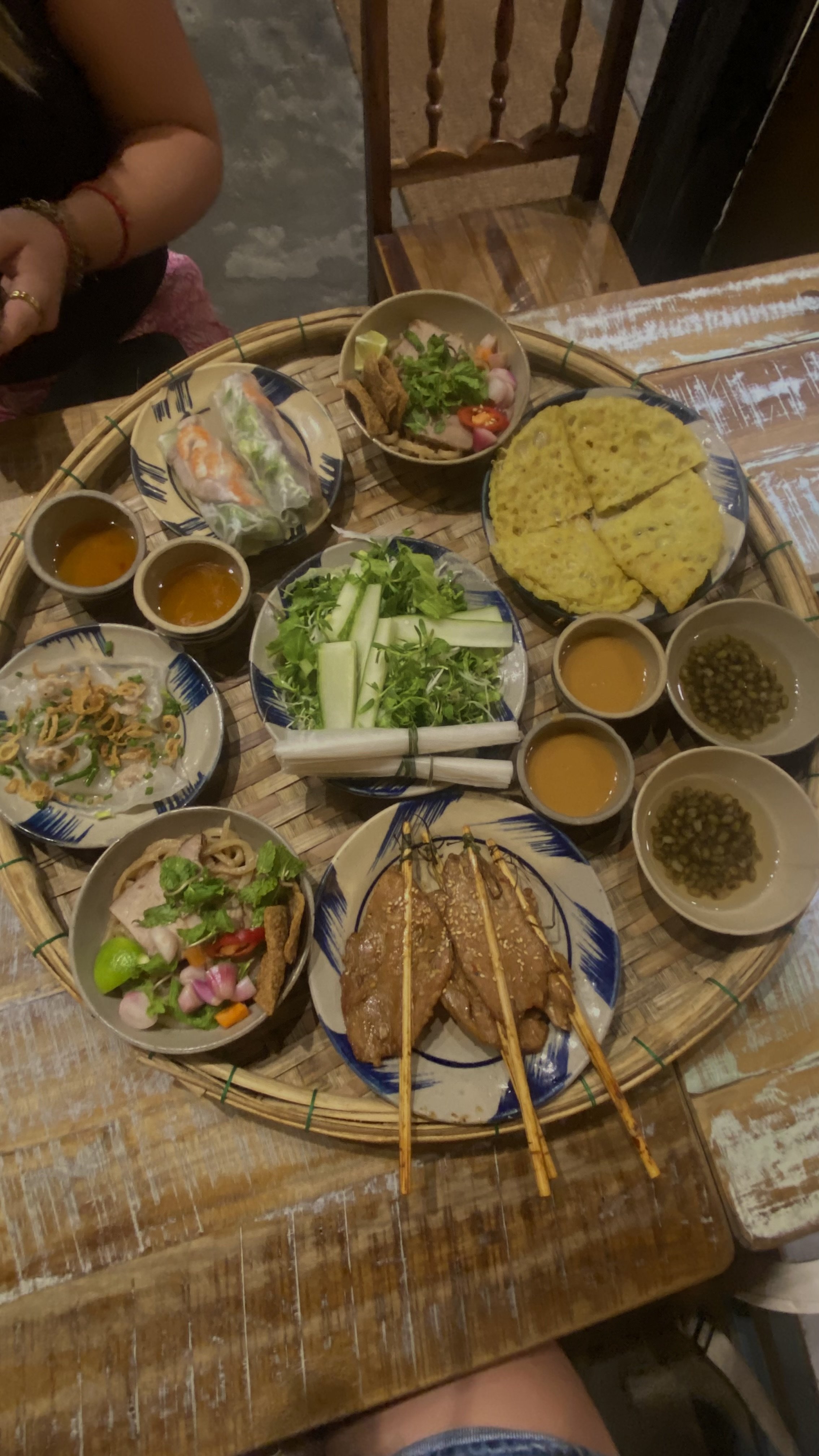 In the class, we learned how to make fresh spring rolls, summer rolls with prawns, pork and tofu in them with a peanut dipping sauce. Next up, we made banh xeo, aka Vietnamese sizzling pancakes. which is made by frying rice milk, turmeric, spring onions, pork and shrimp with steamed bean sprouts. You then eat it inside rice paper, and it was unlike anything I had had before. Finally, we made a beef noodle salad, and in the process, we learnt how to flambé our steak - this was super exciting.